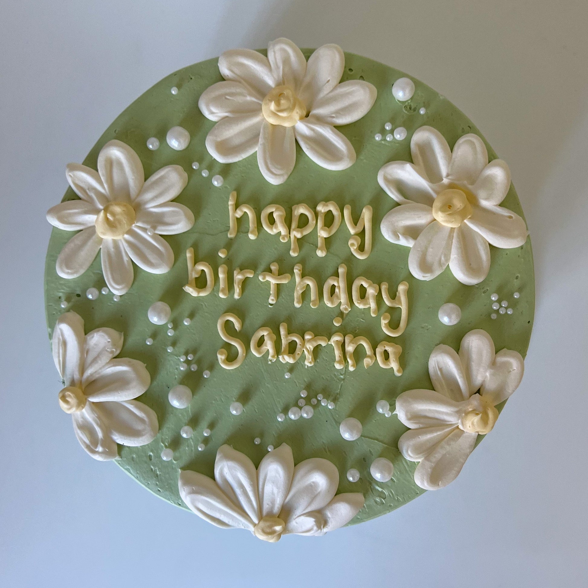 This mini cake is artfully frosted in a soft, sage green buttercream and adorned with elegant white buttercream daisies and delicate pearl sprinkles. The customizable "Happy Birthday" message is piped in a lovely cursive font, making it a perfect, personalized treat. Whether you're celebrating a friend, family member, or yourself, this cake is sure to bring a smile to anyone's face.