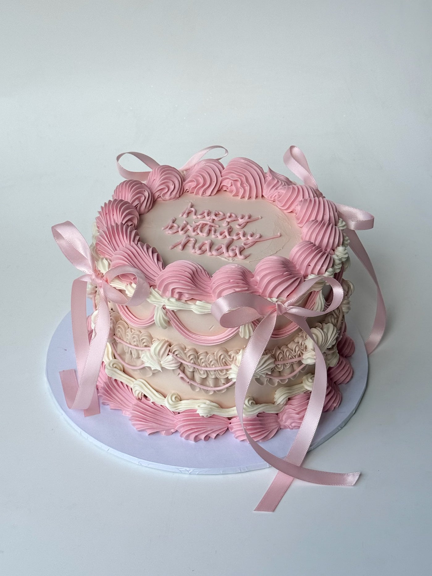 Adorned with delicate pink and ivory buttercream piping and tied with satin bows, this cake feels like a love letter to classic celebrations. Perfect for birthdays, bridal showers, baby showers, or any moment that calls for something dreamy and graceful.